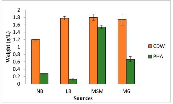 In the medium, carbon and nitrogen contents, which are utilized by the bacteria, decide the productivity of PHAs. Therefore, to enhance the PHA production, the effect of various media on PHA production was studied, and the results are summarized in Figure 2. It is evident from the results that the maximum cell dry weight and PHA production were found in MSM medium (biomass: 37.7 g/L; cell dry weight: 1.8 g/L; and PHA: 1.54 g/L) compared to Luria Bertani, nutrient broth, and YMG (M6). PHA production in terms of PHA concentration, i.e., grams of biopolymer per liter of the cultivation medium, was found minimum in the case of Luria Bertani medium (0.13 g/L).