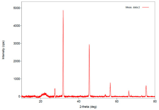 In a recent study, Sedlacek et al. reported that microbes store PHA polymers in amorphous form, which has more elasticity and flexibility in comparison with crystalline [37]. During the extraction procedure (of PHAs), the amorphous form converts into crystalline form. The nature of the extracted PHAs, i.e., amorphous or crystalline, was confirmed through XRD study. The XRD pattern of the extracted PHAs is shown in Figure 5. Diffractogram of the obtained PHAs exhibited six prominent peaks at 27.512°, 31.859°, 45.535°, 56.501°, 66.319°, and 75.310°. These angles coincide with the earlier studies of Alashwal et al. [38] and Mohapatra [39]. The increased intensity of the peaks indicates that extracted PHAs have well organized packed crystalline structure [33]. The d-spacing of the analyzed sample of PHAs indicates that the sample has a well-arranged crystalline structure [38].