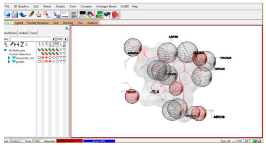 Out of 51 tested PubChem compounds, the compound CID ID 10621 showed the most efficient binding energy of −11.4 (Figure 6). This interaction reflects that ligand CID ID 10621 binds very efficiently with the target protein (citrate synthase). The compound with CID ID 10621 is “hesperidin”, which is a type of flavanon glycoside and generally present in citrus fruits. In general, citrus peels contain hesperidin content in a greater concentration than other parts of the fruit, and this bioflavanoid has a variety of applications [40]. Hence, based upon the results of the above docking interaction, we can speculate that intervention of a potential inhibitor (ligand) helps in the modulation of the TCA biochemical cycle, and ultimately promotes the stress condition of a higher concentration of acetyl-CoA. As we know, acetyl-CoA and oxaloacetate combine with isocitrate with the help of citrate synthase to contribute in the TCA cycle; so, conjecture can be made that the binding of ligand compound CID ID 10621 with citrate synthase tends to the blockage of the TCA cycle and leads to greater accumulation/concentration of acetyl-CoA capable of efficiently participating in the PHA cycle, ultimately resulting in enhanced production of PHA. The inclusion of potent inhibitor (ligand) of citrate synthase (target protein), especially from natural sources (like citrus fruit peels, etc.), after experimental substantiation in the bacterial growth media coupled with optimization of process parameters using cheaper C/N sources [from food (kitchen-/agro-) waste] for enhanced PHA production, might provide an economical approach for minimizing environmental hazard due to synthetic plastics.