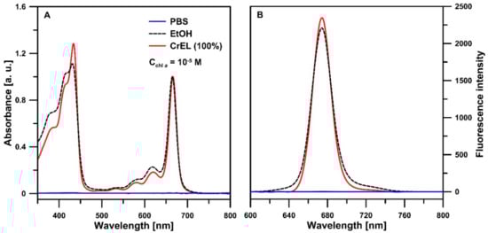 Electronic absorption and fluorescence emission spectra of chlorophyll a dissolved in Cremophor EL, ethanol or PBS buffer. Absorption spectra (A) and fluorescence emission spectra (B) measured from chl a dissolved in CrEL (CrEL (100%), red solid line), 96% ethanol (EtOH, black dashed line) or PBS buffer (PBS, blue solid line, the spectra were magnitude 10 times). The molar concentration of chl a in the samples was 10−5 M. The absorption spectra were normalized in the Q spectral region. The spectra were measured at room temperature.
