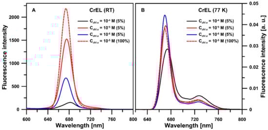 Effect of wt% concentration of Cremophor EL or 96% ethanol in the PBS buffer on the chlorophyll a fluorescence emission intensity. The samples were prepared by chl a dissolution in 15 µL of 96% EtOH followed by its suspension in the PBS buffer containing CrEL (CrEL, A) or EtOH (EtOH, B), respectively, in 0.1, 0.2, 0.5, 1, 2, 5, 25, 50, 100 wt% concentration. The molar concentration of chl a in the samples was 10−5 M. The excitation was at 434 nm. Error bars indicate standard deviation (n = 3 biological replicates).