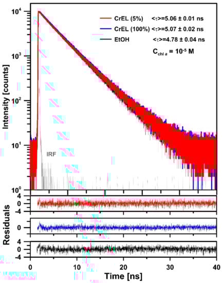 The values of intensity averaged lifetime of chl a fluorescence are τ = 5.06 ± 0.01 ns, τ = 5.07 ± 0.02 ns and τ = 4.78 ± 0.04 ns, respectively. The analysis has shown double (100% CrEL) or triple-exponential decay kinetics (5 wt% CrEL nano-emulsion and 96% EtOH) indicating the presence of different excited molecular species in the samples. The fluorescence decay kinetics were fitted with the components characterized by the following lifetimes: τ1 = 5.7 ns, τ2 = 3.7 ns and τ3 = 0.5 ns in the case of chl a suspended in 5 wt% CrEL in the PBS buffer (5% cremophor nano-emulsion (CrEL (5%)), red line, Figure 5), τ1 = 5.5 ns, τ2 = 3.3 ns in the case of chl a dissolved in CrEL (CrEL (100%), blue line, Figure 5), and τ1 = 4.9 ns, τ2 = 3.0 ns and τ3 = 0.2 ns in the case of chl a dissolved in 96% EtOH (EtOH, black line, Figure 5). The longest lifetime component (4.9–5.7 ns) can be attributed to chl a monomer [54,55]. The ~3 ns component may be assigned to dimers of chl a [55,56]. The fastest lifetime component ranging from 0.2 to 0.5 ns points out to the pigment tendency to form aggregates [54,55]. However, the value of the amplitude of the long lifetime component is on a fine level of 70.6 ± 0.4%, 78.9 ± 0.8% and 91.8 ± 1.9% in the case of nano-emulsion, 100% CrEL and EtOH, respectively, while the shortest lifetime component intensity is only 0.80 ± 0.05% (5wt% CrEL) and 0.50 ± 0.04% (EtOH) of the fluorescence signal. This component is not present in the case of chl a dissolved in 100% CrEL. These findings confirm that chl a encapsulation into the CrEL nano-emulsion is a potential powerful tool for chl a monomerization in an aqueous solution.