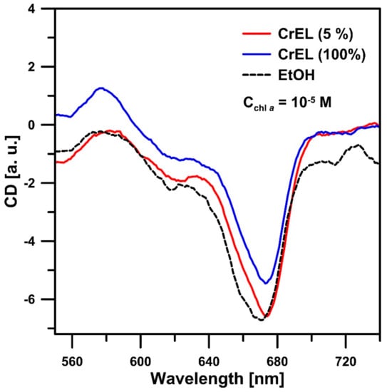 This is possible because of the relationship between the molecular structure of the pigment and its optical activity. In the solution, chl a exhibits a weaker CD signal in comparison to the pigments embedded into the protein bed [57]. Moreover, in the case of chl a monomer, CD signal results from intrinsic asymmetry of the molecule. Molecular aggregates generate characteristic CD spectrum shape (splitting into positive and negative bands) originating from the excitonic interactions between chromophores [51,57,58]. The Q spectral region of CD spectra presented in Figure 6 shows one characteristic negative band at 674 nm (for both cremophor samples) and 668 nm (for chl a dissolved in EtOH). The same behavior was exhibited by the spectrum of bacteriochlorophyll c monomer presented by Olson and Cox [58]. Based on this knowledge, our finding can be interpreted as a confirmation of chl a monomerization in the 5wt% CrEL nano-emulsion.