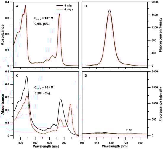 Electronic absorption (A,C) and fluorescence emission (B,D) spectra of chlorophyll a dissolved in 5 wt% Cremophor EL or 5% ethanol-PBS mixture. Absorption spectra suspended in CrEL (5wt%) or 5% EtOH-PBS solution. The spectra were registered directly after the samples preparation (black solid line) and after four days (red dashed line). The emission spectra were registered with excitation in the Soret band maximum. The molar concentration of chl a in the samples was 10−5 M. The samples were kept in the oxygenic condition and in the darkness. The spectra were measured at room temperature.
