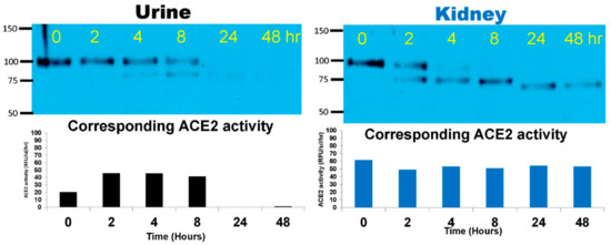 Figure 1. Native mouse recombinant (mr)ACE2 (100–110 kD) was spiked into ACEKO urine (Left) or kidney cortex lysate (10 nM mrACE2/~1 mg total protein of the lysate) from one ACE2KO mouse (Right) and incubated at 37 °C for 48 h. Spiked native mrACE2 samples at 0, 2, 4, 8, 24 and 48 h of incubation were subsequently probed in Western blot. Left Panel. Western blot image of ACE2KO urine spiked with native mrACE2 shows gradual weakening of the 100–110 kD native mrACE2 band and the appearance of smaller 75 kD ACE2 immunoreactive band for up to 8 h. At 24 and 48 h, no ACE2 immunoreactive bands and no ACE2 activity are detectable anymore. Right Panel. Western blot image shows the disappearance of the 100–110 kD mrACE2 band and, first the appearance of a smaller 75 kD ACE2 immunoreactive band, and then a ~60–70 kD band in kidney lysates from ACE2KO mice. In the lower panel, ACE2 activity is depicted showing similar enzyme activities of the 75 and ~60 kD bands versus the original 110 kD mrACE2 band throughout the incubation period; a single time-course experiment for kidney and for urine is shown.
