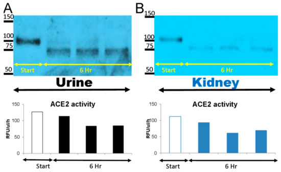 Figure 2. Native mouse recombinant (mr)ACE2 1-740 AA (100–110kD) was spiked into urine (10 nM mrACE2/~0.5 mL urine) (A) and kidney cortex lysates (10 nM mrACE2/~1 mg total protein of the lysate) from three ACE2KO mice (B) and incubated at 37 °C for 6 h. Spiked mrACE2 samples at 0 h (Start) and at 6 h of incubation were subsequently probed in Western blot using an anti-ACE2 antibody. Western blot image shows the disappearance of the 100–110 kD mrACE2 band and the appearance of a smaller 75 kD ACE2 immunoreactive band at 6 h in urine and kidney lysates from ACE2KO mice. In the lower panel, ACE2 activity is depicted showing the enzyme activity of the 75 kD band and the spiked original 100–110 kD native mrACE2 band; urines and kidney lysates from three independent degradation experiments.