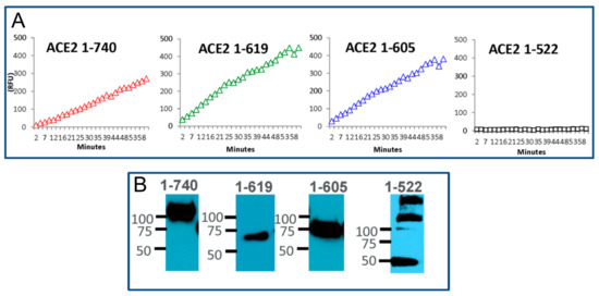 Figure 4. Enzyme activity and molecular size of shorter recombinant ACE2 protein variants. Relative activity of mouse small recombinant ACE2variants and ACE2 protein detection in conditioned media collected 40–60 h after transfection. (A) The cleavage rate of the synthetic fluorogenic substrate Mca-AKP(Dnp) over one hour (shown in relative fluorescence units—RFU) for native rACE2 and small ACE2 variants. Similar to native soluble mrACE2 1-740, mrACE2 variants, 1-619- and 1-605- showed enzymatic activity, respectively, while 1-522 did not exhibit any ACE2 activity. (B) Presence and estimated molecule size were confirmed by Western Blot with antibody against ACE2 ectodomain.