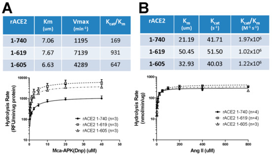 Figure 5. Summary of ACE2-activity assessment of highly purified mouse recombinant ACE2 1-619 and ACE2 1-605 compared to native rACE2 1-740 with a synthetic fluorogenic substrate Mca-APK(Dnp) (A) and with the natural substrate, angiotensin II (B). A higher catalytic activity (Kcat/Km) was found by cleavage of Mca-APK(Dnp) for rACE2 1-619 and rACE2 1-605 than for native rACE2 1-740 (Panel A). The catalytic efficiency to convert Angiotensin II to Angiotensin (1–7) (Kcat/Km) was similar for native rACE2 1-740 and for the small rACE2 variants 1-619 and 1-605 (Panel B). For assessment of activity levels, a Michaelis–Menten model was used to derive the parameters of catalytic kinetics such as Km and Kcat. The values were calculated from three to four independent experiments.