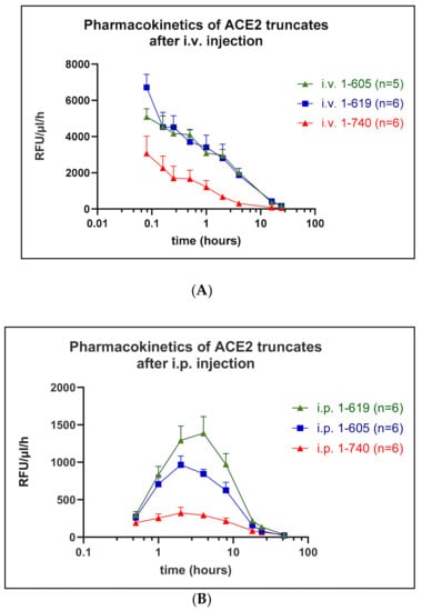 Figure 6. Pharmacokinetics of small ACE2 variants in vivo after i.v. (A) or i.p. injection (B). Wild-type mice (n = 5–6 per experiment) were injected with 1 µg/g BW of native murine rACE2 1-740 (reference protein) or mouse small rACE2 variants 1-619 and 1-605. Venous blood was collected at defined time points after bolus rACE2 injection and ACE2 activity measured using Mca-APK-Dnp fluorogenic substrate; RFU—relative fluorescence unit.