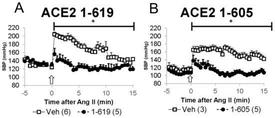 Figure 7. Pre-infusion of 1-619 (A) or 1-605 (B) rACE2 variants (filled circles) cause a faster recovery from acute Ang II-induced hypertension as compared to respective mice pre-infused with PBS as a vehicle (Veh; empty squares). Y-axis is SBP and X-axis indicates time (min) from Ang II bolus (arrow; 0.2 µg/g BW). Two-way ANOVA over time was used for comparisons of the experimental groups; * denotes p < 0.01.