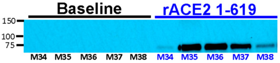 Figure 8. Western blot of urines collected before (Baseline) and after i.v. bolus of ACE2 1-619 variant (0–2 h) from five ACE2-deficient mice, showing an ACE2-immunoreactive band at the expected size of ~70 kD, consistent with the molecular size of the short rACE2 1-619 variant after, but not before, the injection. M34-M38 are ID numbers of the individual ACE2 deficient mice (n = 5) from which urines were obtained at baseline and within 2 h after mrACE2 1-619 infusion. Equal volumes (36 μL) of urines with similar creatinine concentrations (~10–20 mg/dL) were loaded per well.