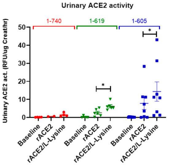 Before injection and after native rACE2 injection, urinary ACE2 activity was not detectable, consistent with the lack of glomerular filtration of the large native rACE2. The tubular reabsorption blocker, L-lysine, moreover, did not result in an appreciable gain in urinary ACE2 activity (Figure 9).