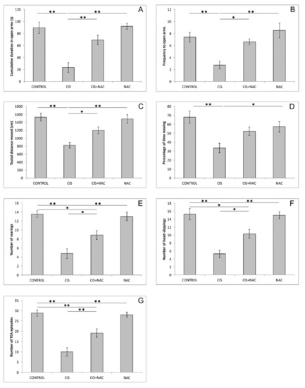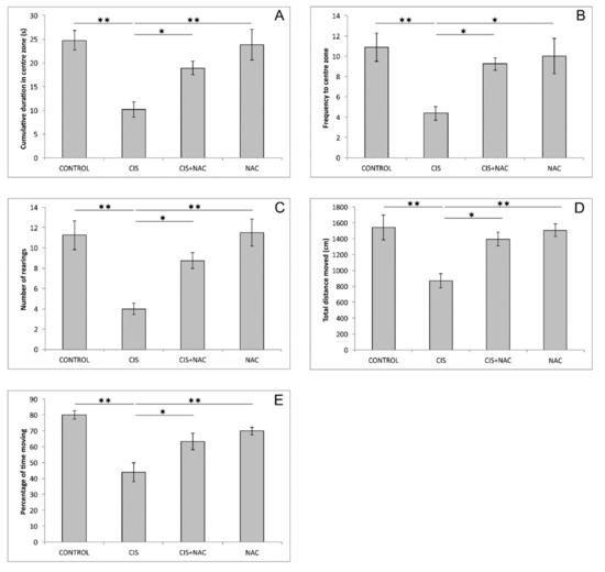 As shown in Figure 1, cisplatin significantly lowered CDCZ and FCZ compared to the control group (F = 9.423 and 5.850, respectively, df = 3, p < 0.01). This anxiogenic feature of cisplatin was attenuated by simultaneous administration of NAC (p < 0.05, compared to the CIS group), which reversed CDCZ and FCZ almost to the control values. The exploratory activity in the OF test expressed by means of the number of rearings also confirmed the anxiogenic effect of cisplatin that was manifested by significant diminishing of vertical locomotion (F = 10.231, p < 0.01). NAC application along with cisplatin was sufficient to significantly increase that type of exploratory activity when compared to the CIS group (p < 0.05). Cisplatin administration also resulted in a significant decrease in locomotion parameters in the OF test (Figure 1D,E) of TDM and %TM (F = 8.552 and 12.551, respectively, p < 0.01) compared to the control values. Again, simultaneous administration of cisplatin and NAC diminished that anxiogenic impact of cisplatin on locomotor parameters (p < 0.05). When applied alone, NAC administration had no significant effect on the parameters from OF test when compared to the control.