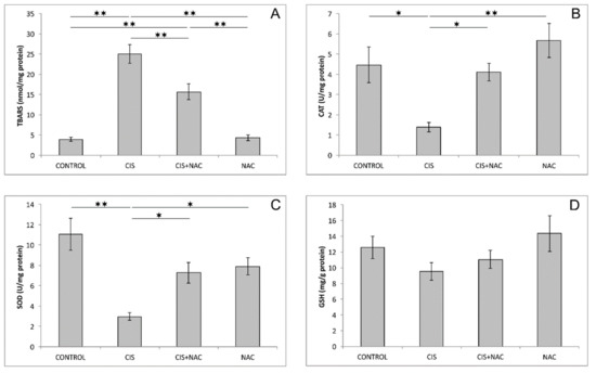 The rats were randomly assigned into four equal groups: control, cisplatin (CIS), NAC, and CIS + NAC groups (n = 8). As shown in Table 1, at the start of the trial (day 1) the control and cisplatin groups received saline (approximately 2 mL i.p.), while the NAC and CIS + NAC groups were administered with NAC (500 mg/kg i.p., Sigma-Aldrich, Munich, Germany). On the fifth day, the control group received saline (in the same manner), the CIS group was treated with cisplatin (7.5 mg/kg i.p.) (Merck, Paris, France), the NAC group was administered with NAC again (500 mg/kg i.p.), and the CIS + NAC group was simultaneously treated with cisplatin and NAC (7.5 and 500 mg/kg i.p., respectively).