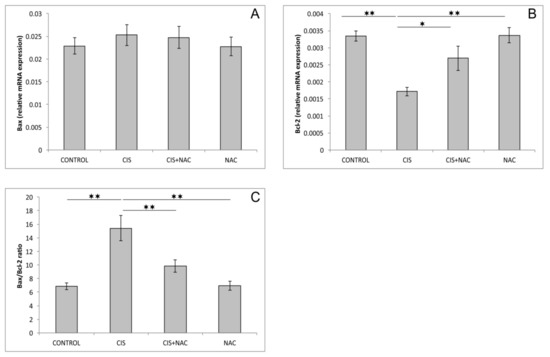 As shown in Figure 4A, none of the applied protocols had a significant impact on relative gene expression of proapoptotic Bax in rat hippocampi (F = 0.352, df = 3). However, the relative gene expression of hippocampal Bcl2 (Figure 4B) was significantly altered in this trial (F = 11.143). A single application of cisplatin significantly decreased the relative expression of this antiapoptotic gene compared to the control group (p < 0.01). This proapoptotic action of cisplatin was significantly attenuated (p < 0.05) by simultaneous NAC administration. This effect was also demonstrated by a significantly lower Bax/Bcl2 ratio (F = 12.866, p < 0.01) compared to cisplatin alone. Neither pro- nor anti-apoptotic relative gene expression in the rat hippocampus was significantly affected by NAC, compared to the control values, when applied alone.