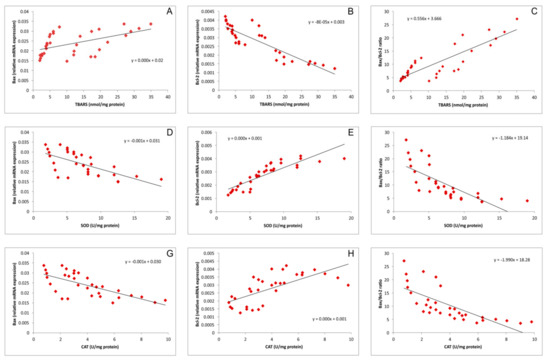 Relationship between the parameters of oxidative status in the rat hippocampus and the relative gene expression of apoptotic genes in the rat hippocampus for all investigated groups (A,B,C—represents the relationship between TBARS and Bax, Bcl-2 and Bax/Bcl-2 ratio, respectively; D,E,F—represents the relationship between SOD and Bax, Bcl-2 and Bax/Bcl-2 ratio, respectively; and G,H,I—represents the relationship between CAT and Bax, Bcl-2 and Bax/Bcl-2 ratio, respectively).