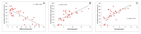 Relationship between the cumulative duration in the open arms and the hippocampal oxidative stress markers (A,B,C—represents the relationship between CDOA and TBARS, SOD, and CAT, respectively).