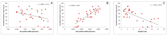 Relationship between the cumulative duration in the open arms and the relative expression of pro- and anti-apoptotic genes in the rat hippocampus (A,B,C—represents the relationship between CDOA and Bax, Bcl-2 and Bax/Bcl-2 ratio, respectively).