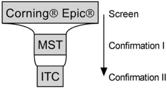 The aim of the present study was to validate complementary biophysical assays for the identification of novel ApoE4 chemical probes. Biophysical techniques have become key components of the drug-discovery process for drug targets like ApoE4 that are structurally enabled and are routinely used for hit identification and/or confirmation [42], although these techniques can be limited by the amount of needed protein, sample preparation and throughput. The Corning Epic label-free technology measures a change in the wavelength of refracted light when an analyte binds to a target that is immobilized on a biosensor [43]. The technique is very sensitive and affinities in the nanomolar range can be determined. A microgram of the material is required, and the 384-well plate format allows screening in a high-throughput format. However, buffers must be well-matched for additives and solvents, and nonspecific interactions of compounds with the immobilization medium can result in artificial signals. Furthermore, the covalent binding of the protein to the biosensor may affect protein structure and functionality. Due to the limitations of individual biophysical methods, validation of hits by orthogonal assays, in the present study MST and ITC, are often used to increase confidence in identifying protein–ligand interactions. Microscale thermophoresis monitors the movement of molecules in a temperature gradient, with this movement being tracked by a fluorophore that is covalently coupled to the molecule. The interaction of two molecules (e.g., drug binding to protein) alters this movement and can therefore be used to detect binding [44]. Microscale thermophoresis requires relatively low amounts of material, and thermophoresis curves can give information on unspecific effects such as ligand-induced protein aggregation. Although automated systems are available, the nonautomated capillary-based system used in the present study only allows relatively low throughput (up to 16 samples at a time), and additional validation steps may be required if extrinsic labelling is used. Finally, ITC can provide additional information on thermodynamic parameters and binding stoichiometry. High protein consumption and low throughput limit ITC in hit validation [42]. It is for these various reasons that we decided to use the Corning Epic for hit identification, and MST as well as ITC for hit validation (Figure 1).