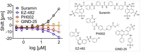 The Corning Epic biochemical label-free assay was used as the primary screen for new ApoE4 tool compounds with MST, as well as ITC being used for hit confirmation (Figure 1). A sodium citrate buffer at pH 5.6 and ApoE4 at a concentration of 300 µg/mL were identified as the optimal conditions to immobilize ApoE4 on Corning Epic biosensors, and used to test the binding of previously described ApoE4 chemical probes: GIND-25 (or Azocarmine G, Sigma-Aldrich, Gillingham, UK) [24], PH002 [27] and EZ-482 [31]. Additionally, we tested suramin for binding since it was reported to decrease the association of ApoE3 to the extracellular matrix of HepG2 cells [32,33,34], and is likely doing this by antagonizing the binding of ApoE to heparan sulfate proteoglycans via the ApoE heparin binding site [35]. Only suramin positively shifted the reflected wavelength, whereas PH002 and EZ-482 had slight negative shifts, which suggests the binding of these compounds to the reference surface of the biosensor. No binding of GIND-25 was detected in the used concentrations (Figure 2). Suramin was therefore used as the positive control and confirmed binding in all biophysical assays (Figure 3).