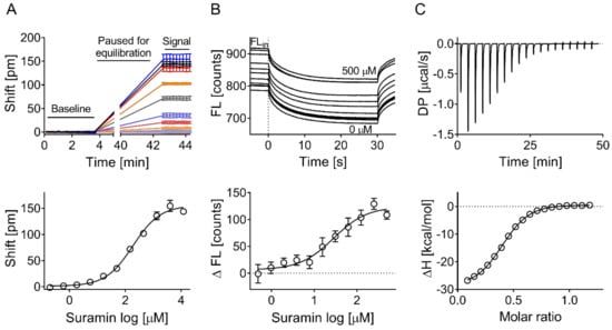 After thermal equilibration of the Corning Epic plate and baseline read (see above), the measurement was paused, the plate removed, and suramin added into the wells (total volume 30 μL) in triplicate at different concentrations, ranging from 0 to 12 mM. The plate was sealed and placed back into the Epic for 30 min. Binding shifts were then measured over 15–20 points in total, with 4 averages per point. Responses were measured as shifts in reflected wavelength and were expressed in picometers (pm).