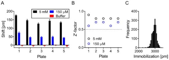 Data were extracted with the Epic Analyzer (built 27 February 2015, Corning). Shifts were corrected for background by subtracting the averaged response of the buffer control. Samples with low protein-immobilization levels (<1800 pm) were excluded from data analysis and only plates with a Z′-factor above 0.5 were accepted. The Z′-factor is defined as: