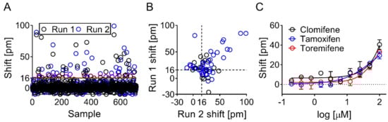 Screening and hit identification on the Corning Epic. (A) Hit threshold was set to five times the median absolute deviation (MAD), and a shift above 16 pm was considered a hit. In total, 59 compounds met the criteria to be considered a hit. (B) The correlated shifts from both runs are shown. Forty-five of these hits indicated as blue circles were prioritized and tested in 10-point concentration response assays on the Corning Epic, with a top concentration of 100 μM, and 14 compounds showed a concentration-dependent effect, examples of which are shown in panel (C). Remaining binding curves are found in Supplementary Figure S4.