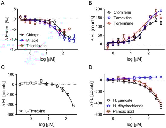 Hit confirmation by microscale thermophoresis. Hits were tested by concentration response from 500 or 250 μM. (A) Three out of these eight hits altered thermophoresis without affecting the initial fluorescence (chlorpromazine, meclofenamic acid, thioridazine), (B) three increased initial fluorescence (clomifene, tamoxifen, toremifene), and (C,D) two reduced initial fluorescence (l-thyroxine, hydroxyzine pamoate) in a concentration-dependent fashion. (D) Pamoic acid reduced initial fluorescence in a concentration-dependent fashion. Data are expressed as the mean ± SD of three independent experiments.