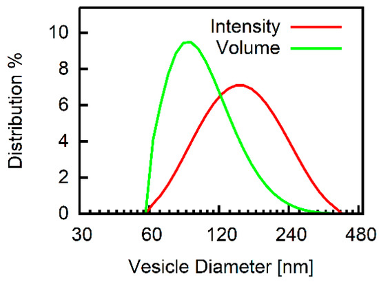 The volume distribution returned by the Dynamic Light Scattering (DLS) measurements indicated a mean diameter of about 110 nm for DOPC vesicles. For each preparation, the diameter was determined and used for the calculations (e.g., Equation (10)). A representative measurement is shown in Figure 2.