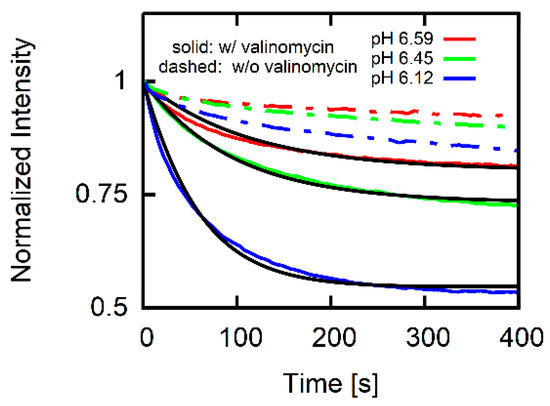 Acidification of the external solution leads to a decline in (Figure 3). We apply the above developed system of differential Equations (10)–(16) assuming that 1 μM of the potassium ionophore valinomycin clamps to almost zero. Accounting for the absence of AH () and substituting Equation (14) for a Fickian flux equation for protons yields . The value is in the range of previously reported values [41]. Thus, is negligibly small since AH uptake leads to 100 times faster acidification of the vesicular interior (Figure 4). Performing the same experiment without valinomycin (dashed lines in Figure 3) yielded a much slower decaying pH since < 0 mV. This observation supports our assumption that the permeation of counterions (e.g., chloride) does not significantly contribute to albeit counterions are present in much larger concentrations than protons.
