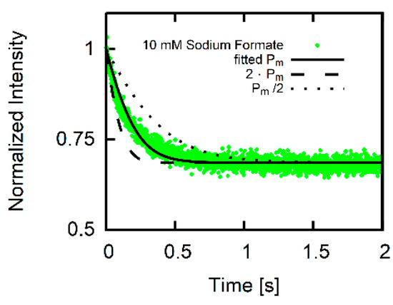 Sensitivity of the fit to Fluorescence trace for 10 mM sodium formate and 10 mM MES (middle trace of middle panel in Figure 4) together with the result of the fitting procedure (solid black line). Curves for double (dashed black line) or half (dotted black line) the fitted reveals that the algorithm calculates traces sensitive for changes in .