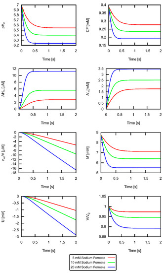 To illustrate the importance of buffer effects, we plotted the large changes of intravesicular pH for different weak acid concentrations (Figure 6). For the highest acid concentration (conditions of middle panel of Figure 4), the pH drop halved . The fluorescence signal is proportional to that also changes with the same time constant. It is important to note that the chemical reactions of , , and are not rate limiting in our experiments—as Figure 5 confirms. They take place much faster than the permeation of formic acid. The 10% decrease in volume occurred with a somewhat slower time constant as the pH drop due to the limited water permeability. The changes of the impermeable are much more pronounced than those of the permeable . Finally, we show the time course of how (here depicted as ) charges the membrane, thereby giving rise to .
