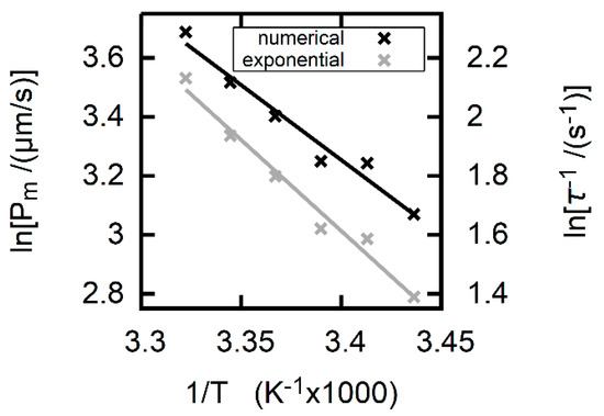 The energy barrier that a membrane imposes to permeation is experimentally accessible via temperature dependent measurements of [37,38] or a parameter that is proportional to . Commonly, the activation energy is extracted via an Arrhenius plot (Equation (21); [39]):