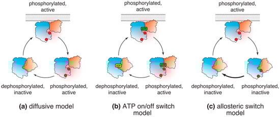 An extension of the diffusive model was an elegant hypothesis proposed by Lin et al. [49]. It is based on the fact that, while ATP-competitive inhibitors induce paradoxical hyperphosphorylation of Akt in cells [48,51,52], ADP analogs fail to do so [49]. In line with the “phosphatase shielding cage” model, Lin et al. [49] concluded that ATP and ATP analogs protect T308 and S473 from dephosphorylation both in vitro and in cells. They proposed that exchange of ATP for ADP in the active site upon catalysis promotes Akt inactivation by interfering with the “phosphatase shielding cage” mechanism, making ADP-bound Akt a better substrate for cellular phosphatases (Figure 2B).