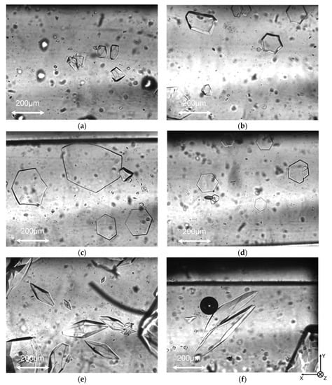 - Butler, M.F. Freeze concentration of solutes at the ice/solution interface studied by optical interferometry. Cryst. Growth Des. 2002, 2, 541–548. [Google Scholar] [CrossRef]