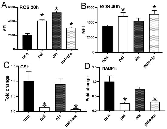 Palmitate treatment of PBMCs altered cellular redox balance: Cellular reactive oxygen species (ROS) at (A) 20 h post activation or (B) 40 h post activation in the presence or absence of palmitate (pal) and oleate (ole) per Figure 1. Y axis is mean fluorescence intensity (MFI), an approximation of the number of molecules of ROS in the cells. (C) reduced glutathione (GSH), and (D) NADPH were measured at 40 h post-stimulation +/− pal/ole. N = 6–8 per treatment. Each N represents cells from one subject. * p < 0.05 vs. control (con).