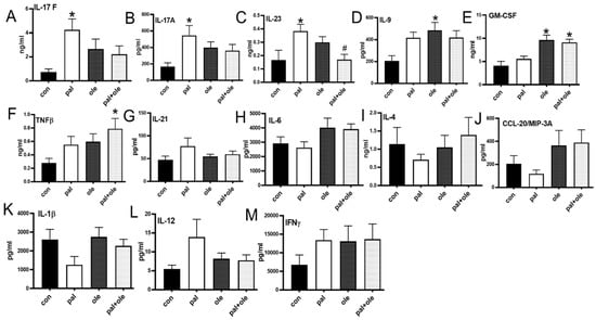 Palmitate promotes production of characteristic Th17 cytokines. Cytokine production from cells stimulated in the presence or absence of palmitate (pal) and oleate (ole) per Figure 1 and assessed via multiplex. The concentrations of other cytokines assessed by the multiplex assay (IL-10, IL-13, IL-15, IL-22, IL-33, IL-2, IL-5, IL-17E, IL-27, IL-31, TNFα, TNF-β, IL-28A) remained unchanged after the different treatments (not shown). N = 9–10 in each treatment. Each N represents cells from one subject. * p < 0.05 vs. control (con). Interleukin (IL), Tumor Necrosis Factor α (TNFα), Tumor Necrosis Factor β (TNFβ), Interferon γ(IFNγ), Chemokine (C-C motif) ligand 20 (CCL20)/ Macrophage Inflammatory Protein-3 (CCL20/MIP3A), Granulocyte Macrophage Colony Stimulating Factor (GM-CSF).
