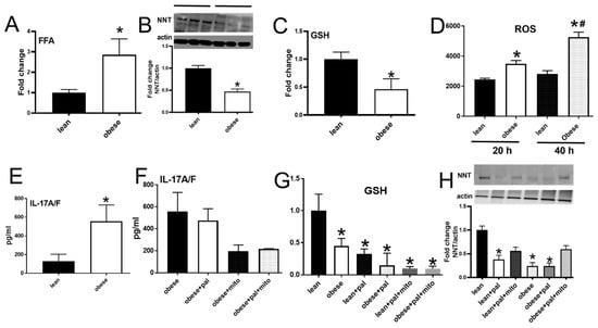 NNT expression was blunted in PBMCs from obese non-diabetic subjects. Circulatory free fatty acid levels were assessed in the plasma of lean and obese subjects (A) PBMCS from lean or obese subjects (Table 1) were analyzed for (B) NNT on Western blots (C) glutathione (D)ROS production 20 h and 40 h post activation and (E) IL-17A/F production. The production of (F) IL-17A/F (G) GSH and (H) NNT expression was assessed after palmitate +/− the mitochondrial free radical scavenger MMitoTempo (mito). A N = 6, B&D N = 5, C,E,F,G,H N = 7–8. Each N represents one subject. * p < 0.05 vs lean. # p < 0.05 vs. obese.
