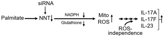 Schematic description of the findings. The saturated fatty acid palmitate blunts the expression of the mitochondrial redox regulator NNT. This leads to decreased cellular NADPH and glutathione anti-oxidant, resulting in a redox imbalance, more mitochondrial ROS, and higher concentrations of proinflammatory Th17 cytokines. These events become mitochondrial ROS-independent following 20 h of stimulation, and partially recapitulate the T2D-associated Th17 cytokine profile. Knock-down of NNT by siRNA recapitulates the effects of palmitate.