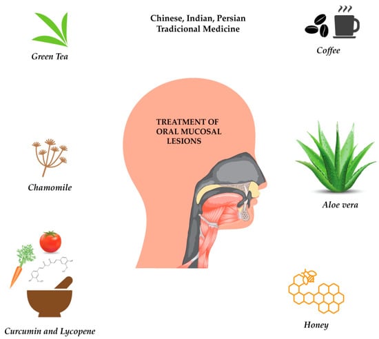 Traditional knowledge on medicinal plants used for different health purposes has attracted much attention among the scientific community because of their effectiveness in the treatment of many diseases [9,10,11,12,13,14,15], including oral diseases [16]. There are many reports on the use of natural products and their derived bioactives, often called phytochemicals, in oral disease treatment [16,17,18]. It has been demonstrated that medicinal plants rich in several chemical constituents are highly effective in OML treatment. In this sense, based on the above-highlighted aspects, the present review aims to provide a close relationship between plant-derived bioactives and OML treatment efficacy. A special emphasis was also given to plant-derived bioactives with anti-oral mucosal lesion activity, with a special emphasis to curcumin, lycopene, chamomile, Aloe vera, green tea, and Coffea. Finally, preclinical (in vitro and in vivo) and clinical studies examining the safety and efficacy of these medicinal plants and their derived bioactives were also carefully examined.