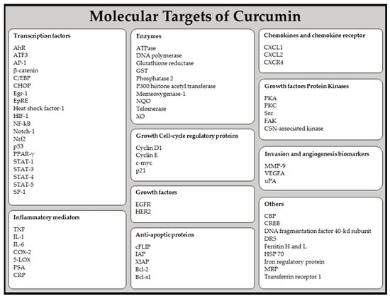 Molecular targets of curcumin. AhR, aryl hydrocarbon receptor; ATF, activating transcription factor; AP, activator protein; CBP, P300/CREB-binding protein; CHOP, C/EBP homologous protein; COP, constitutive photomorphogenic; COX, cyclooxygenase; CREB, cAMP response element binding; CSN, COP9 signalosome; CXCL, chemokine ligand; CXCR chemokine receptor; cFLIP, cellular FLICE-like inhibitory protein; CRP, C-reactive protein; DR, death receptor; EGFR, epidermal growth factor receptor; Egr, Early growth response; EpRE, electrophile response element; FAK, focal adhesion kinase; GST, glutathione S-transferase; HIF, hypoxia inducible factor; HSP, heat-shock protein; IAP, inhibitor of apoptosis protein; IL, interleukin; LOX, lipoxygenase; MMP, matrix metallopeptidase; MRP, multidrug resistance protein; NQO, naphthoquinone oxidoreductase; NADP(H), nicotinamide adenine dinucleotide phosphate (reduced form); Nrf2, NFE2-related factor; NF-κB, nuclear factor-kappa B; MRP, multi-drug resistance protein; PPAR-γ, peroxisome-proliferator-activated receptor-gamma; PKA, protein kinase A; PKC, protein kinase C; PSA, prostatic specific antigen; STAT, signal transducers and activators of transcription protein; TNF, tumor necrosis factor; uPA, urokinase plaminogen activator; VEGF, vascular endothelial growth factor; XIAP, X-linked IAP, XO, xanthine oxidase.