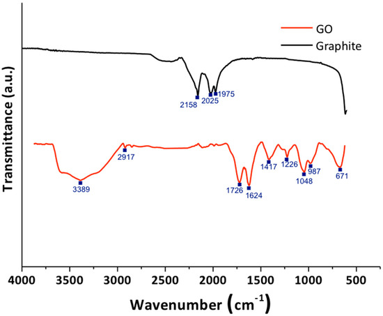 Figure 1 shows the FTIR spectrum of graphite and graphene oxide. For the graphite, it exhibits few absorption signals, due to the difference in the state of charges between carbon atoms. This weak difference leads to a very small induced electric dipole, which provides a very clean spectrum [26]. It is clear that when an oxidation treatment is used on the material, bands corresponding to oxygenated functional groups appear, which indicates that the oxidative process was successful. The graphene oxide spectrum showed the band at 3389 cm−1, which corresponds to the stretching vibration of the hydroxyl groups (O–H). The band at 2917 cm−1 corresponds to the vibration of the C–H bond that is in sp3 hybridization. The band at 1726 cm−1 corresponds to the stretching vibration of the carbonyl group (C=O). The band at 1624 cm−1 corresponds to the stretch mode of the sp2 carbon skeletal network (C=C). It is also evident, according to some results reported in the literature, that the GO obtained contains several oxygen functional groups, such as hydroxyl, carboxyl, and epoxy groups, which correspond to the bands presented at 1417, 1226, 1048, 987, and 671 cm−1 [25,27,28].