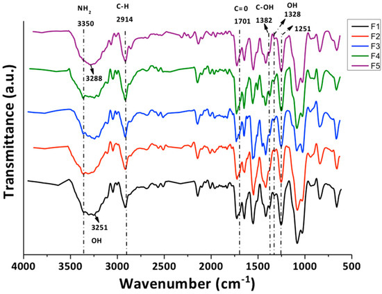 Attenuated total reflectance Fourier-transform infrared (ATR-FTIR) spectroscopy of chitosan/poly(vinyl alcohol)/graphene oxide (CS/PVA/GO) films for the five formulations. F1: CS/PVA/GO 20:80:0; F2: CS/PVA/GO 14.75:85:0.25; F3: CS/PVA/GO 19.5:80:0.5; F4: CS/PVA/GO 14.25:85:0.75 and F5: CS/PVA/GO 29:70:1. All the ratios are wt %.