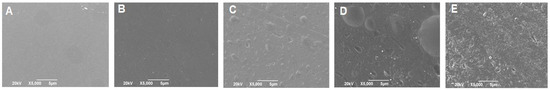 As shown in the SEM micrographs (Figure 5), an increase in the roughness of the film surface is evidenced in the different formulations, the morphology of the films changes from a smooth structure for formulation F1 (F1; Figure 5A), to an utterly rough morphology for formulation F5 (F5; Figure 5E). Previous studies have shown that the surface of pure CS and PVA films separately is smooth, continuous and compact [16,38], so it is expected that the mixture between them will also present a surface with the same conditions, which is consistent with the results found, because the PVA offers good compatibility when incorporated into polysaccharides such as CS. By adding GO to the CS/PVA mixture, the GO nanosheets generate an increase in the roughness of the films due to their texture [35]. There is also a specific porosity which is possibly associated with the rapid evaporation of the solvent during the curing of the films, air bubbles or separation of polysaccharide molecules during the curing process of the films [16].