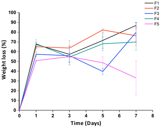 Weight loss vs. time. F1: CS/PVA/GO 20:80:0; F2: CS/PVA/GO 14.75:85:0.25; F3: CS/PVA/GO 19.5:80:0.5; F4: CS/PVA/GO 14.25:85:0.75 and F5: CS/PVA/GO 29:70:1. All the ratios are wt %. Data are shown as mean ± standard deviation of the mean (n = 3).