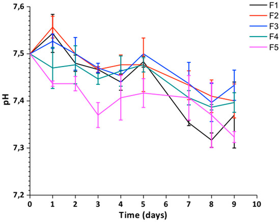 Study of the pH solution vs. immersion time in simulated body fluid (SBF) of the films. F1: CS/PVA/GO 20:80:0; F2: CS/PVA/GO 14.75:85:0.25; F3: CS/PVA/GO 19.5:80:0.5; F4: CS/PVA/GO 14.25:85:0.75 and F5: CS/PVA/GO 29:70:1. All the ratios are wt %. Data are shown as mean ± standard deviation of the mean (n = 3).