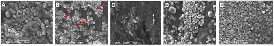 Morphology of CS / PVA / GO films after seven days in the degradation process in SBF. (A) F1: CS/PVA/GO 20:80:0; (B) F2: CS/PVA/GO 14.75:85:0.25; (C) F3: CS/PVA/GO 19.5:80:0.5; (D) F4: CS/PVA/GO 14.25:85:0.75; (E) F5: CS/PVA/GO 29:70:1.