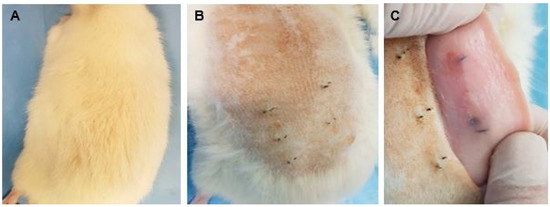 The dorsal area where the implantation was performed after 30 days. (A) Hair recovery; (B) absence of injuries and infections; (C) internal surface of the skin where the implanted samples encapsulated by scar tissue.