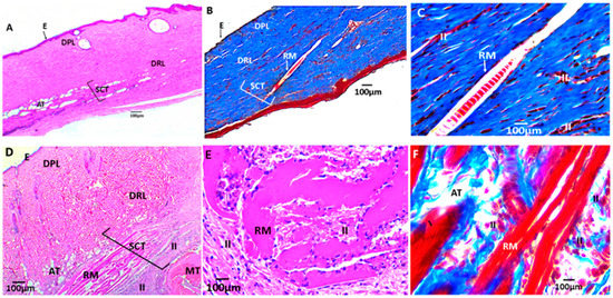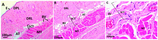 (A–C) Histological analysis of sample control. E: Epidermis; DPL: Dermis papillary layer; DRL: Dermis reticular Layer; BV: Blood vessels; AT: Adipose tissue; MT: Muscular tissue; SCT: Subcutaneous cellular tissue. (A) 4×; (B) 10×; (C) 40×.