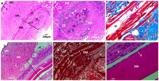 Histological analysis of experimental samples: (A–C) formulation F2 (CS/PVA/GO 14.75:85:0.25) and (D–F) formulation F3 (CS/PVA/GO 19.5:80:0.5). All the ratios are wt %. E: Epidermis; DPL: Dermis papillary layer; DRL: Dermis reticular layer; BV: Blood vessels; AT: Adipose tissue; H: Hypodermis; MT: Muscular tissue; SCT: Subcutaneous cellular tissue; RM: Remnant material; II: Inflammatory infiltrate. (A) 4×; (B) 10×; (C) 40×; (D) 4×; (E) 10×; (F) 40×.